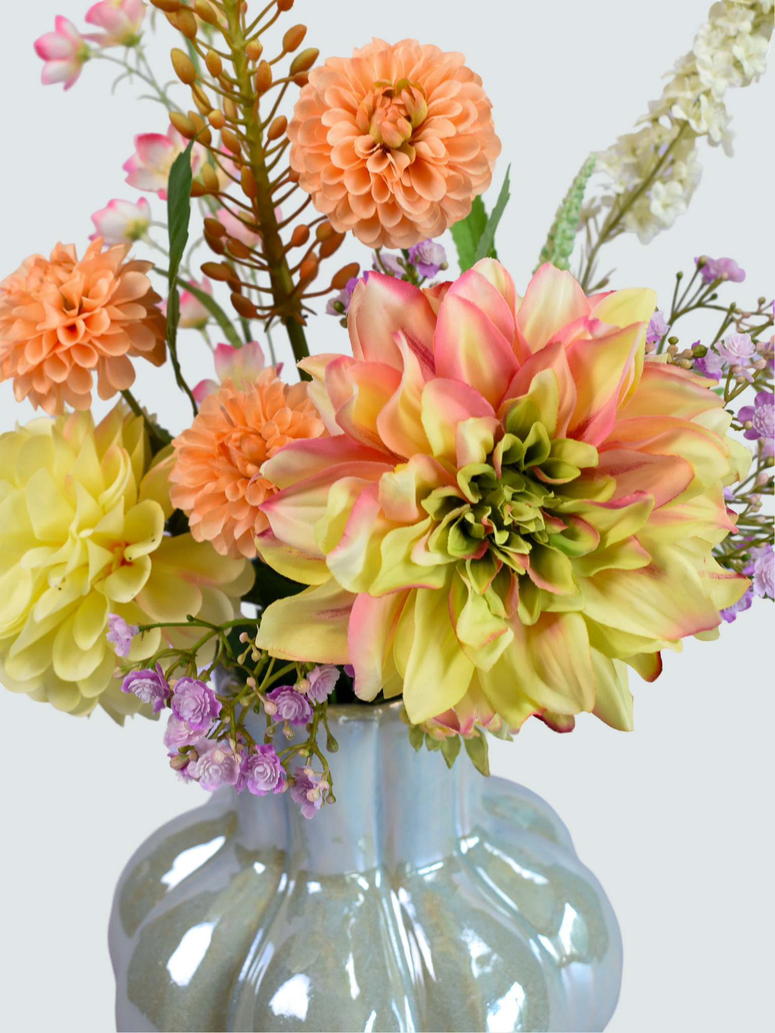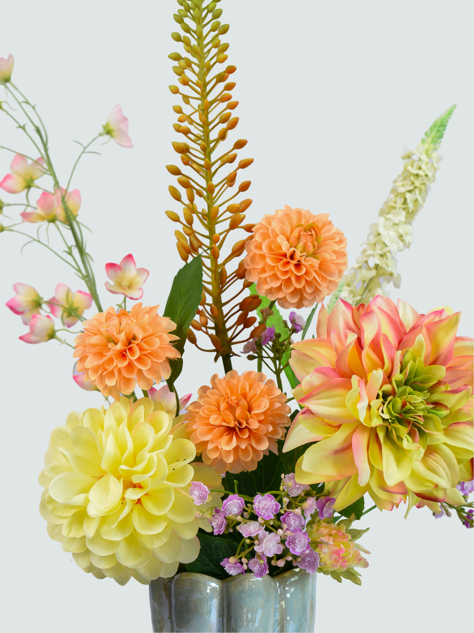 Het kunstbloemen boeket bestaat uit 7 stelen en bevat Dahlia's, Delfinium en Zinnia's.